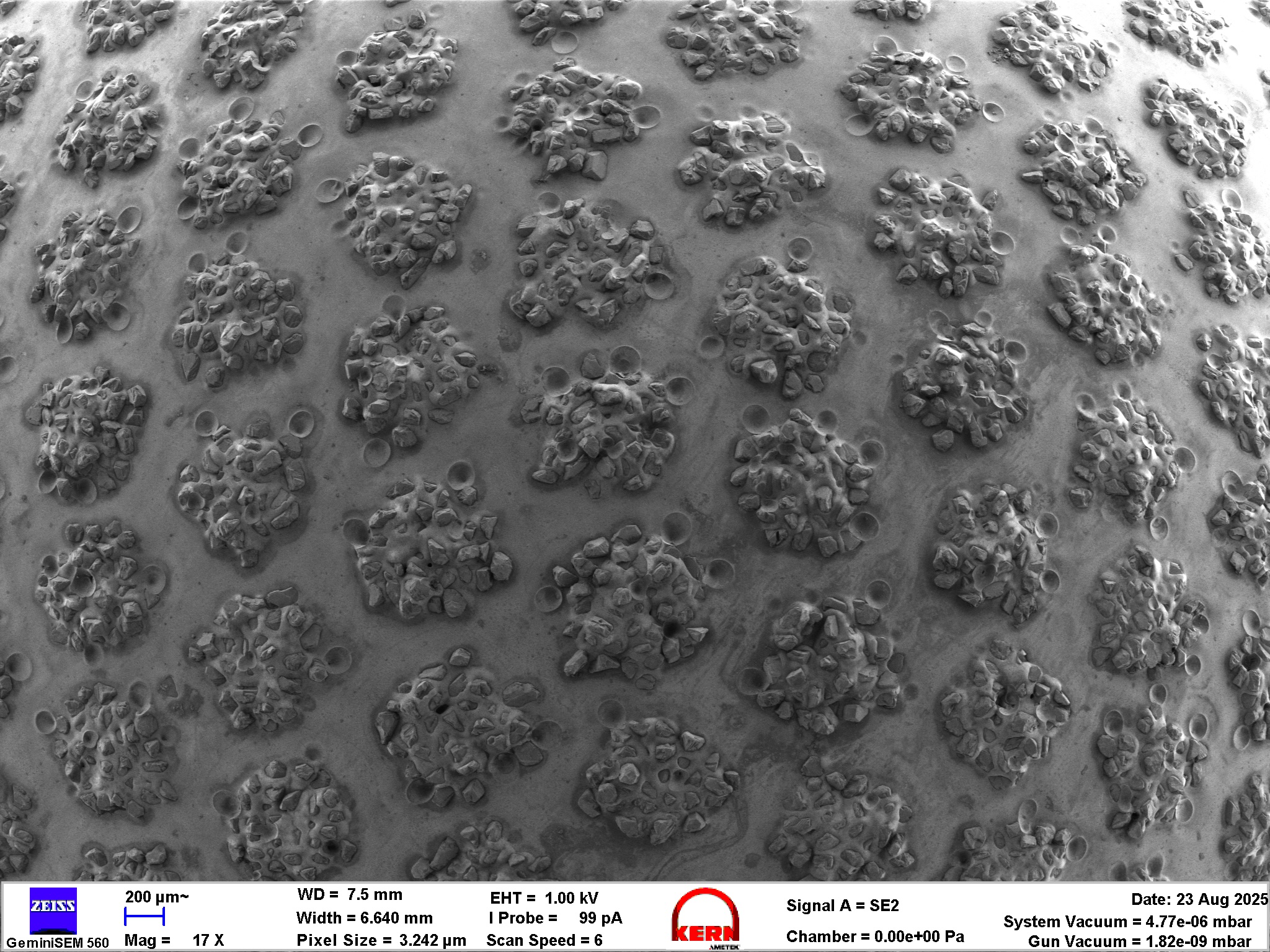 Moving in a bit closer, we can see that this is correct. The individual piles of the diamonds are several grains “high”, I would expect about 2-3 layers of diamond on this stone. This is very cool, as it will double or tripple the lifetime of this stone, making it better value than a single layer EP stone. The small dimples visible at the side of each pile are probably where the mask for the pattern had contact – or some airbubbles got caught.